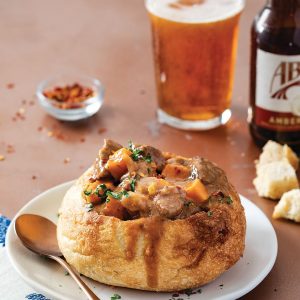 - In same pot, melt butter over medium heat. Add onion, celery, thyme, salt, black pepper, red pepper, and garlic powder; cook until onion is softened and translucent. Add tomato paste, and cook, stirring frequently, until color deepens, about 3 minutes. Add flour, and cook, stirring frequently, until flour is golden brown, 3 to 5 minutes. Increase heat to high, and add beer, scraping browned bits from bottom of pot with a wooden spoon. Bring to a boil, and add beef and broth. Return to a boil, and add sweet potato. Reduce heat to medium, and simmer until meat and sweet potato are tender and liquid has thickened, about 45 minutes. Garnish with parsley and red pepper, if desired.