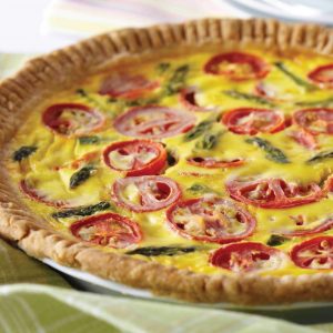 - Heat oven to 375°F. Blanch asparagus in boiling water for 1 minute. DRAIN well. Sprinkle cheese evenly in bottom of pie shell top with asparagus and tomatoes in an even layer.