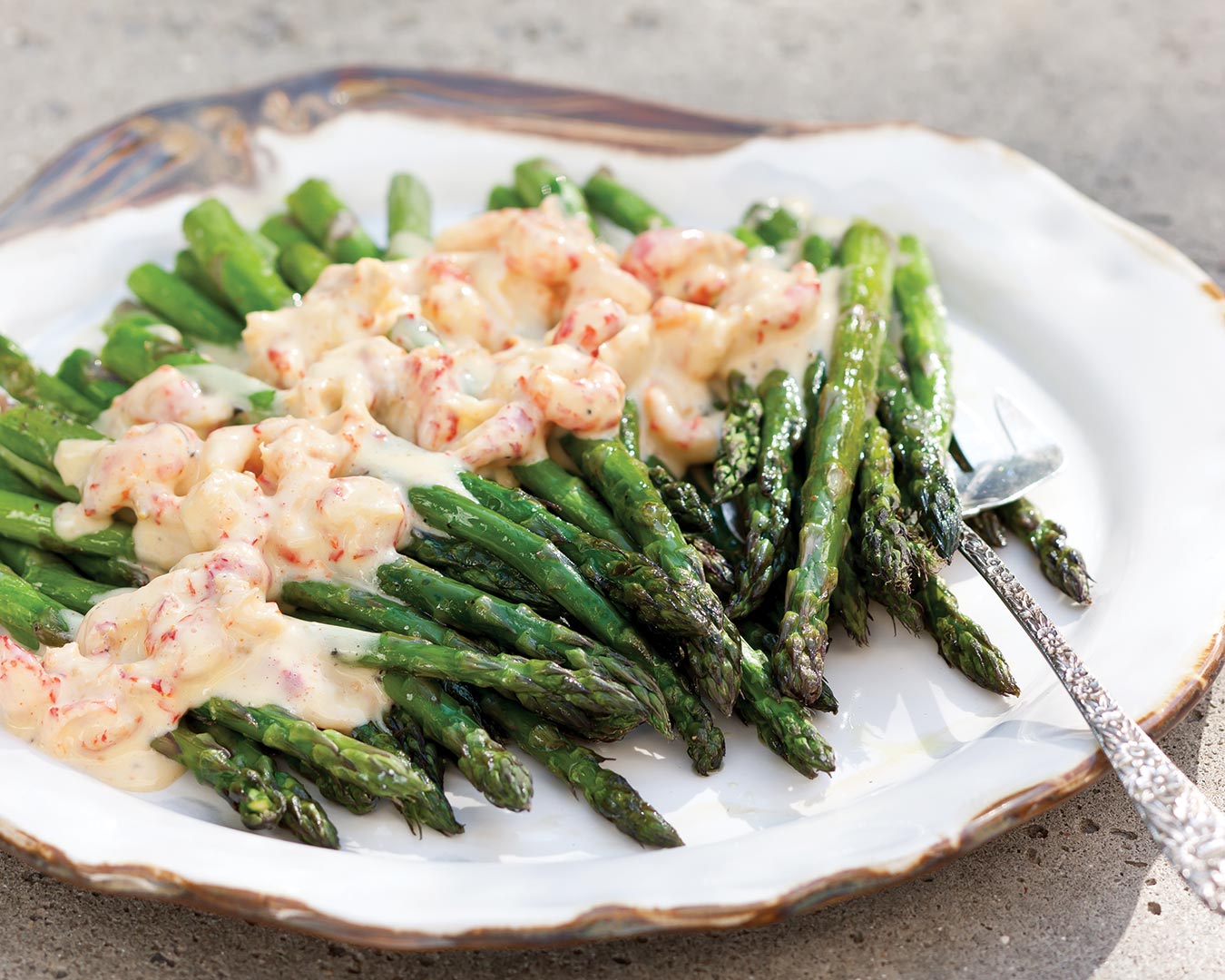 - Meanwhile, add water to a large saucepan, and bring to a simmer. In a stainless steel bowl, add egg yolks, lemon juice, salt, and cayenne. Hold bowl over simmering water making sure bottom of bowl does not touch water, and whisk vigorously until volume of egg mixture doubles. Slowly whisk in melted butter until sauce is thick and combined. Remove from heat, and stir in crawfish. Serve immediately over asparagus.