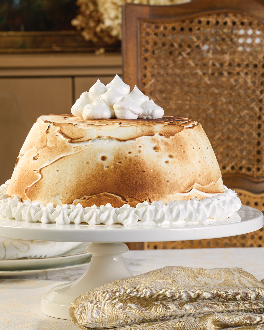 - Brown the Baked Alaska quickly with a handheld kitchen torch to lightly brown the meringue. Decorate with the reserved meringue and serve.