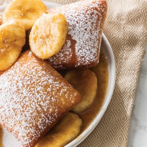 Warm Bananas Foster Sauce is a delightful accompaniment to these fluffy beignets.