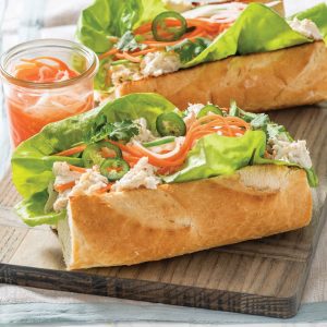 - Line baguette with lettuce. Fill each with about ½ cup crabmeat mixture. Using a slotted spoon, top with Pickled Vegetables. Top with jalapeño and cilantro. Serve with remaining Pickled Vegetables.