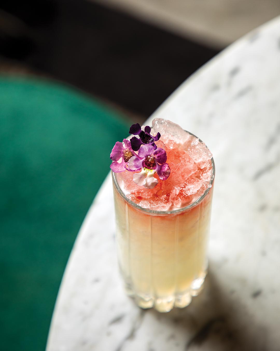 1. In a cocktail shaker, add gin, pineapple syrup, lemon juice, and absinthe; shake and strain into a collins glass mostly filled with crushed ice. Top with a splash of soda and more ice. Top with bitters, and garnish with flowers, if desired. Cheers!