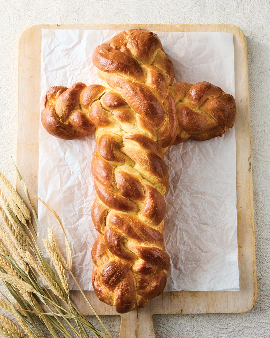 - On a lightly floured surface, roll remaining dough into a 10-inch log, and repeat cutting and braiding procedure. Place large and small braids on prepared pan in shape of a cross, and press overlapping parts slightly together. Cover and let rise in a warm, draft-free place (75°) until doubled in size, 1 to 1½ hours.
