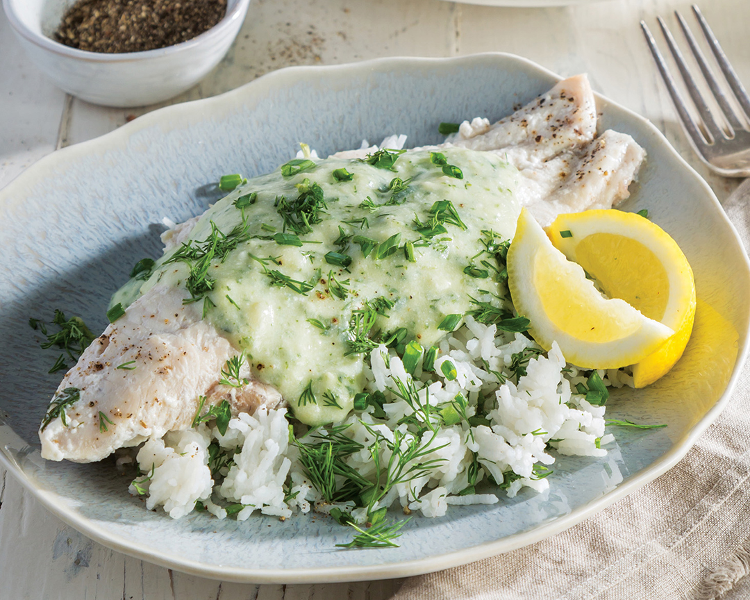 - Serve catfish over Herbed Rice with buttermilk mixture. Serve with lemon wedges. Garnish with dill, chives, and pepper, if desired.