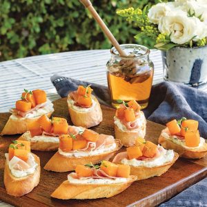 - Spread a layer of goat cheese mixture onto each baguette slice. Place a piece of prosciutto on top of goat cheese mixture. Top with squash, and garnish with honey and thyme, if desired.