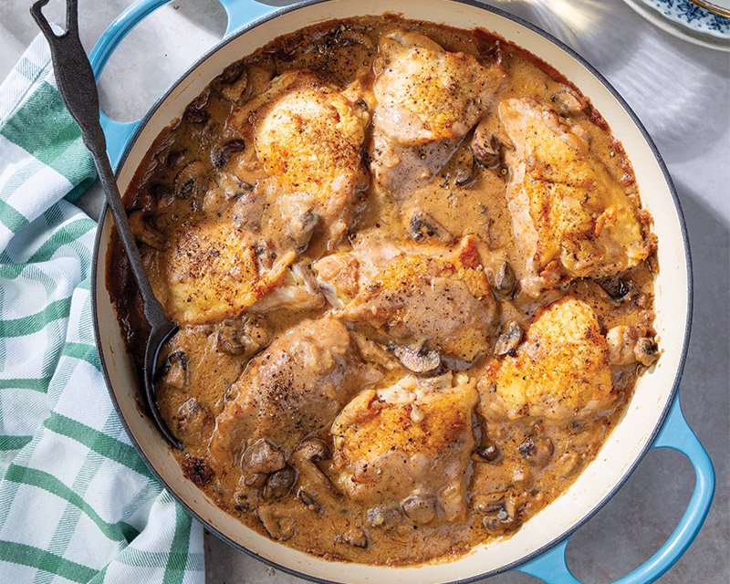 - Return chicken to pan. Cover and simmer for 10 minutes. Uncover and simmer until aninstant read thermometer inserted in thickest portion registers 165°, about 20 minutes. Remove chicken from pan.
