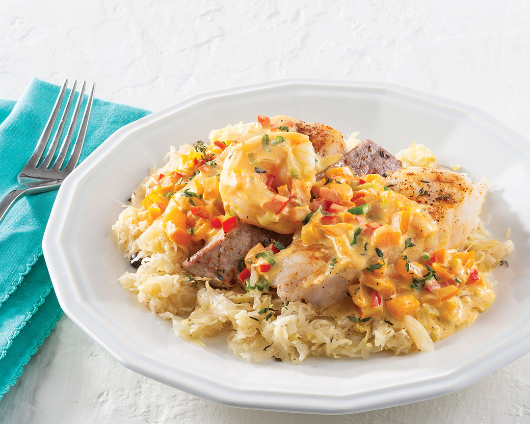 Chef Baumann’s reinterpretation of this favorite dish had all the markings of traditional choucroute garnie but with what I considered a Louisiana addition: a trio of fresh fish. I thought about this for a moment. If Louisiana is a melting pot of cultures and cuisines, I could borrow from Chef Baumann to revolutionize the River Road classic. Thus, my recipe for Choucroute du Golfe was born. Remember, don’t prejudge the worth of a dish by its ingredients or outward appearance; rather, indulge in the decadence of a new masterpiece! Bon appétit!