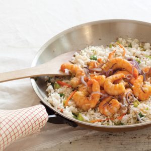 When Shreveport native Claudius Whitmeyer’s wife told him it was his turn to cook, he began at the barbecue pit, eventually moving on to one-pot meals. He graduated to gumbos soon enough and later came up with this clever stir-fry. Dubbed a home run by his family, the dish comes together quickly if you have some leftover rice, and Claudius’s wife, Glynda, calls it “spicy but not too spicy.”
