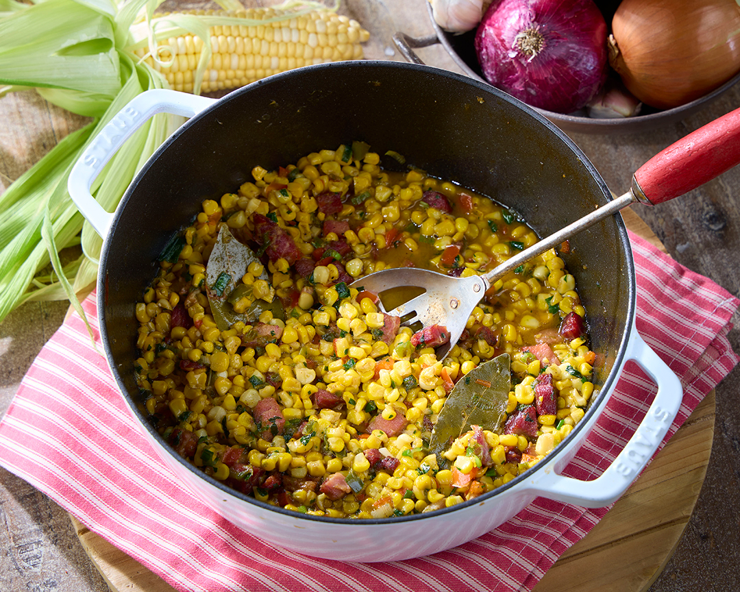 A true Louisiana classic, Corn Maque Choux is a rich and flavorful Louisiana side dish made with fresh corn, smoky tasso ham, colorful bell peppers, and aromatic seasonings. Simmered in a savory chicken stock with a hint of heat from jalapeño and hot sauce, this dish delivers bold, comforting flavor in every bite. Finished with fresh green onions and parsley, it’s the perfect companion to grilled meats, seafood, or any summertime gathering. This easy, one-pot recipe is ideal for showcasing the best of seasonal, farm-fresh corn.
