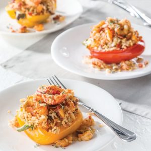 Crawfish tails, bacon, and tomatoes offer a fresh twist to these stuffed bell peppers.