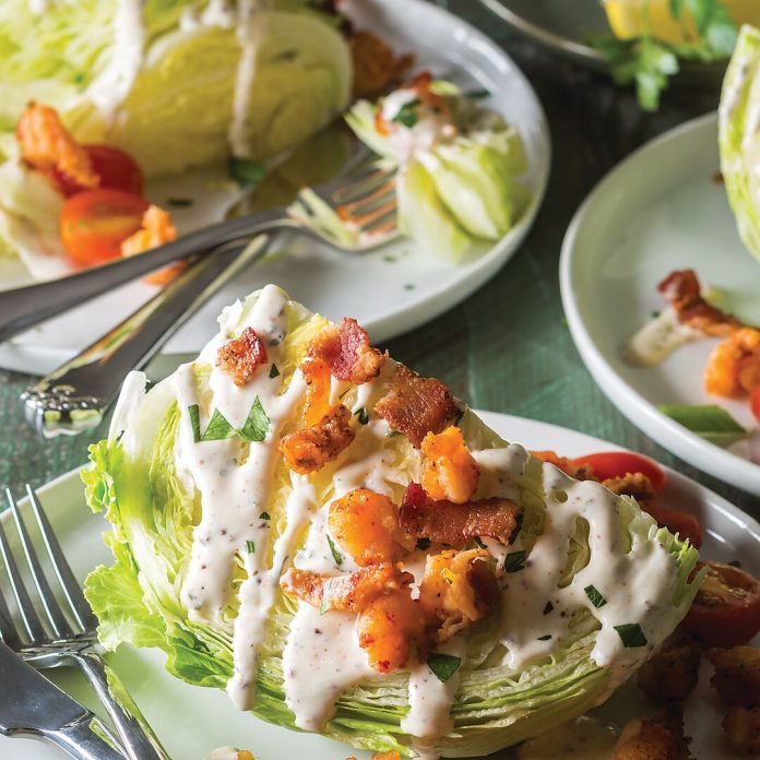 This wedge salad is served with plenty of crawfish tails and buttermilk dressing spiced with Cajun seasoning.