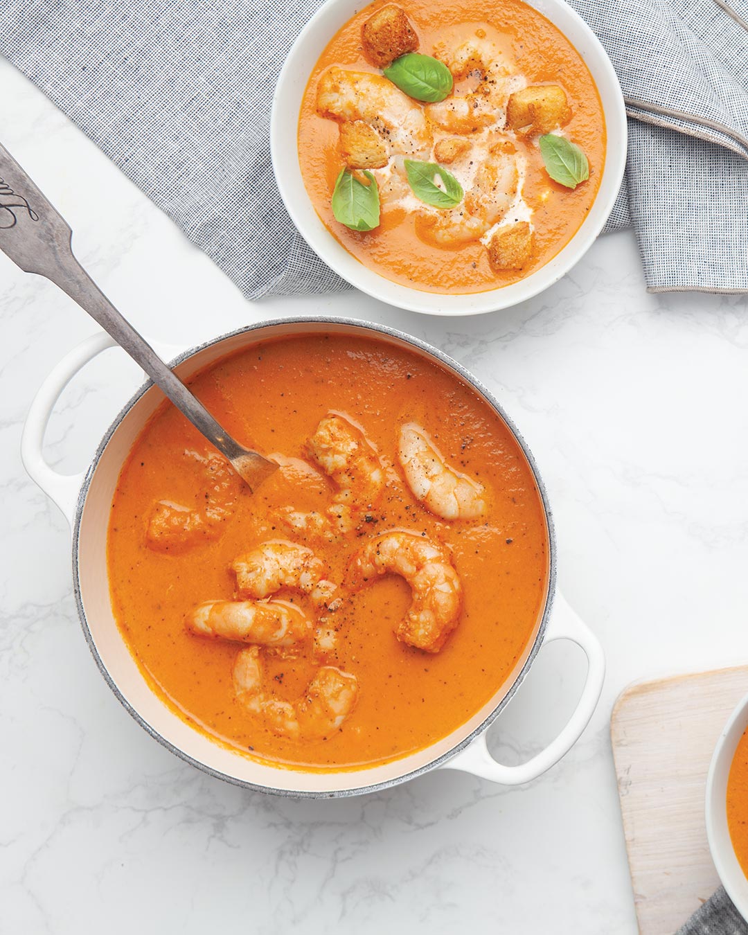- Return soup to pot, and reduce heat to medium-low. Stir in shrimp. Cook, stirring occasionally, until shrimp are pink and firm, 3 to 4 minutes. Stir in ½ cup cream, and remove from heat. Drizzle servings with remaining ¼ cup cream, and season to taste with pepper. Garnish with croutons and fresh basil, if desired.