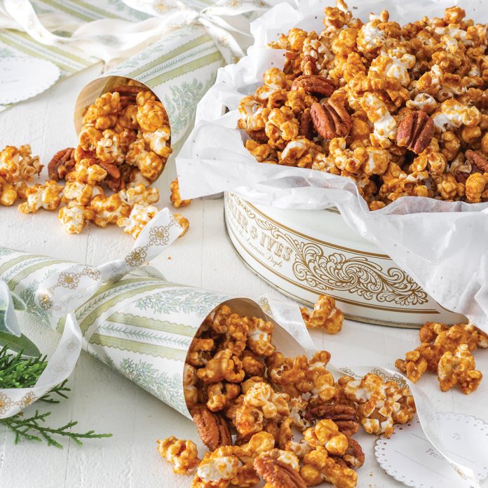 - In a large saucepan, combine brown sugar, butter, and cane syrup. Cook over medium heat, stirring occasionally, just until bubbles form around edges of pan; cook, stirring occasionally, for 5 minutes. Remove from heat. Stir in baking soda. (Mixture will foam.) Evenly pour over popcorn mixture. Gently stir to coat.