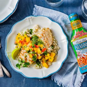 Creole Chimichurri Red Pepper and Mango Halibut with Cilantro Couscous