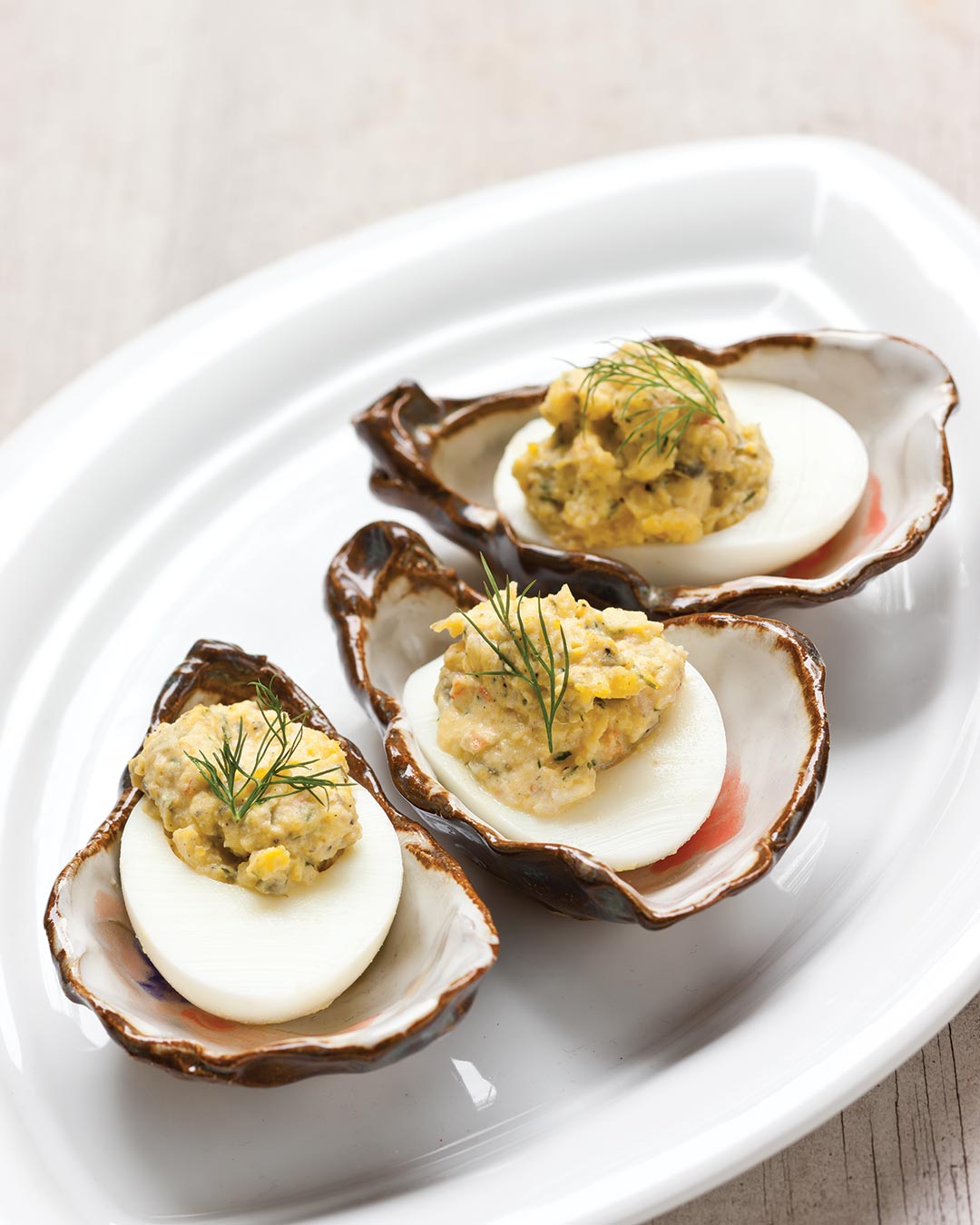 - Mash yolks with a fork, and add shrimp, mayonnaise, dill, lemon juice, mustard, capers, pepper, salt, and hot sauce. Using a rubber spatula, stir until well combined. Divide egg yolk mixture equally between egg whites with a spoon. Garnish with fresh dill, if desired.