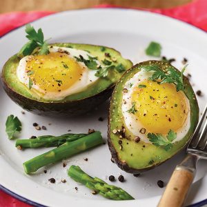 - Break an egg into the center of each of the avocado halves, being careful to keep the yolks intact. Season to taste with salt and pepper.