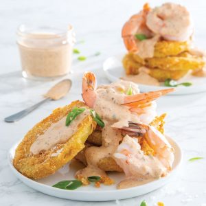 Crispy fried green tomatoes are complemented with a zesty rémoulade sauce and succulent shrimp in this dish.