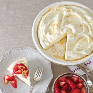 - In a medium bowl, combine strawberries and remaining 2 tablespoons sugar; let stand for 15 minutes. Remove pie from freezer 5 to 10 minutes before serving. Top with strawberries. Garnish with lemon zest, if desired.