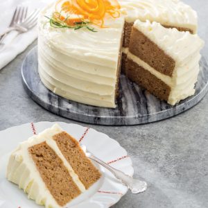 - Bake until a wooden pick inserted in center comes out clean, 30 to 35 minutes. Let cool in pans for 15 minutes. Remove from pans, and let cool completely on wire racks. Spread Orange Buttercream between layers and on top and sides of cake. Refrigerate until ready to serve. Garnish with sage, rosemary, and orange, if desired.