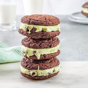 The grasshopper cocktail was reportedly created in 1918 at Tujague’s Restaurant. In these ice cream sandwiches, we replaced the traditional crème de menthe and crème de cacao with peppermint extract and bittersweet chocolate.