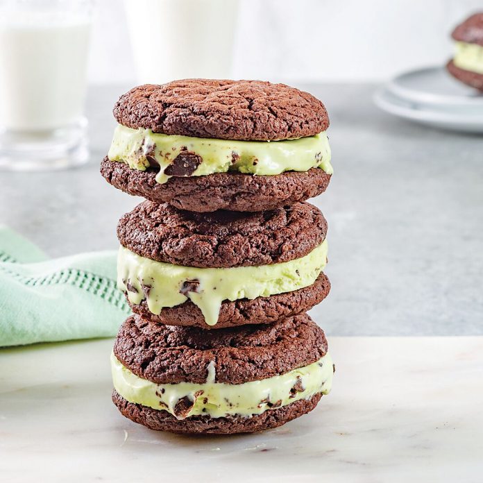 6. Using a 2¾-inch cookie cutter, cut 7 portions of No-Churn Grasshopper Ice Cream. Place ice cream disks on flat side of half of cookies. Place remaining cookies, flat side down, on top of ice cream. Freeze ice cream sandwiches until ready to serve. To store longer, wrap sandwiches individually in plastic wrap, and freeze for up to 3 months.