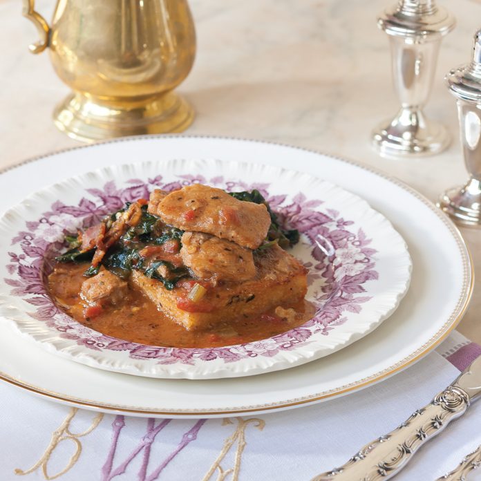 - Remove and discard bay leaves, and season pork with salt and pepper. Serve with Sweet & Spicy Collards over Loaded Grits Cakes. Add hot sauce, if desired.