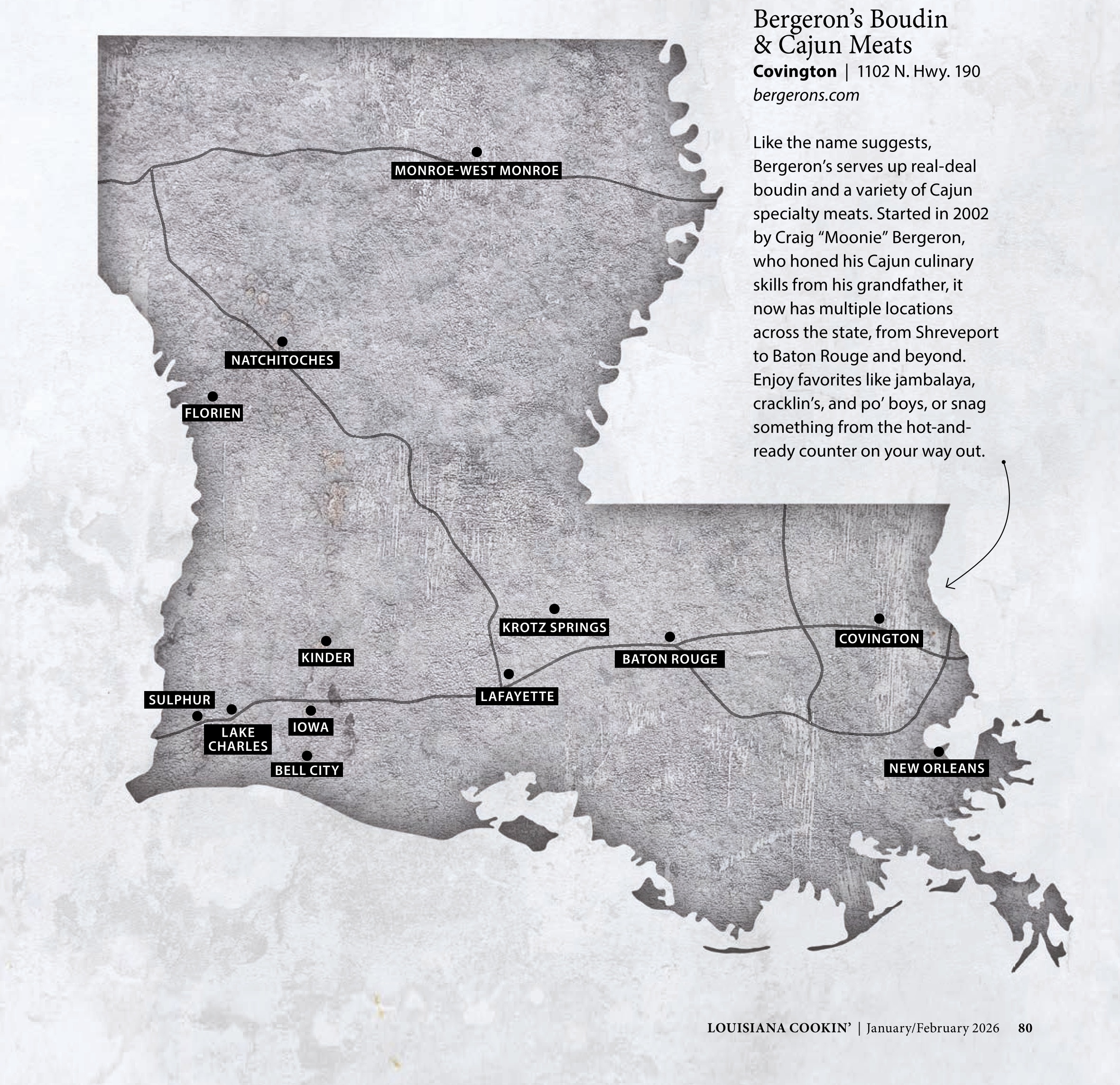 Whether you’re stocking up on meats for your freezer or grabbing a snack for the road, shoppers at In-Laws Cajun Specialties will not be met with disappointment. Boudin (and boudin balls) come in delectable flavors like smoked pepper jack, crawfish, and, of course, original, and the sausages keep things interesting with flavors like green onion garlic and jalapeño Cheddar. Stop by the new location in Moss Bluff for the shrimp sauce piquante over rice or fan-favorite fried ribs.