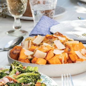 - Place roasted sweet potatoes in a serving dish. Pour sauce over sweet potatoes, gently tossing to coat. Top with cheese. Serve hot.