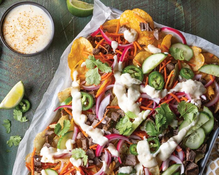 - On a rimmed baking sheet, arrange chips in a single layer. Top with cheese sauce, steak, Pickled Vegetables, pickled jalapeño, blue cheese, cilantro, cucumber, and sliced jalapeño.