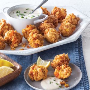 5. Using a 1½-tablespoon spring-loaded scoop, scoop batter, and fry in batches until golden brown and cooked through, 3 to 4 minutes. Let drain on a wire rack set over paper towels. Transfer to a rimmed baking sheet, and keep warm in oven while frying remaining batter. Serve warm with mayonnaise mixture and lemon wedges. Garnish with chives, if desired.
