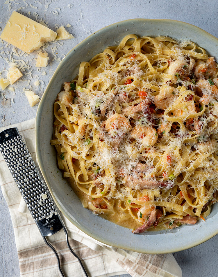 - Add pasta, 2 to 3 cups pasta cooking water, and 2 tablespoons butter to tasso mixture, and bring to a boil over high heat, stirring frequently; add more pasta cooking water, if needed, to get the sauce to your desired texture. Add shrimp and remaining 2 tablespoons butter, and cook, stirring occasionally, just until shrimp are pink and firm, about 3 minutes. Turn off heat.