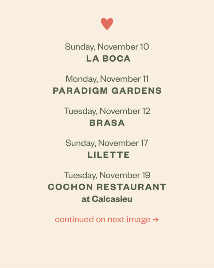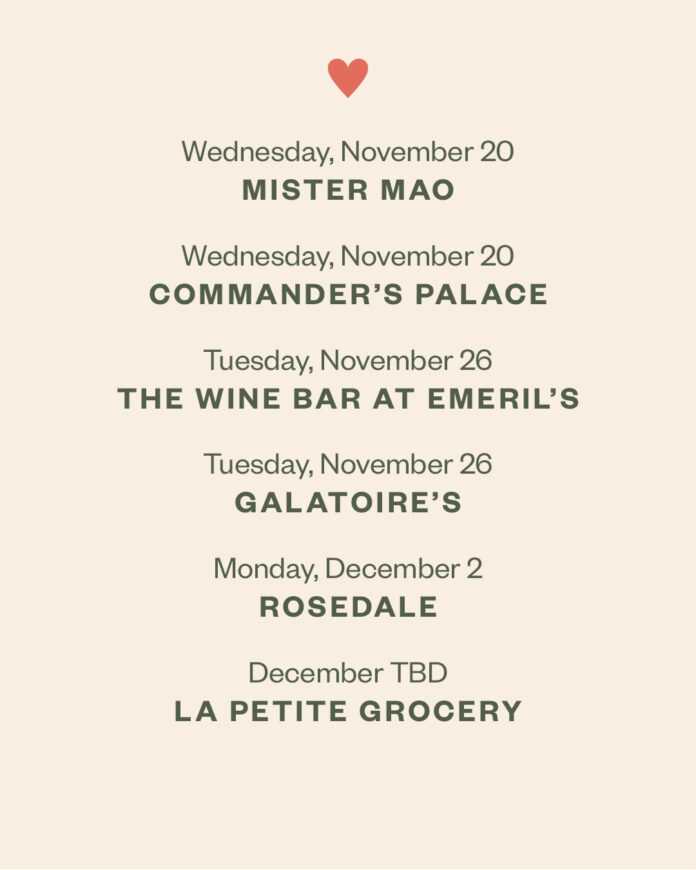 The series kicks off on November 6 and runs through the holiday season, with each participating New Orleans restaurant donating 100% of the proceeds from their event to the Always Asheville Fund, established by Explore Asheville. This nonprofit fund aims to provide emergency grants to independent restaurants across Asheville and Buncombe County, helping them to rebuild and sustain their businesses in the aftermath of the storm.