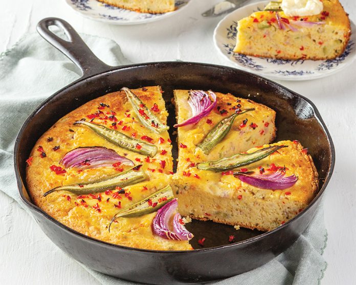 Packed with a colorful mix of fresh okra, bell pepper, and onion, this delectably moist cornbread tastes as showstopping as it looks.