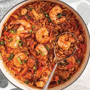 This easy and filling dish is like jambalaya but with rice-shaped pasta.