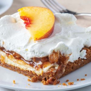 - Gently spread pudding mixture into crust. Gently spread peach mixture onto pudding. Spread remaining whipped cream on top. Refrigerate for 8 hours or overnight. Let stand for 10 minutes before serving. Garnish with peach slices, if desired.