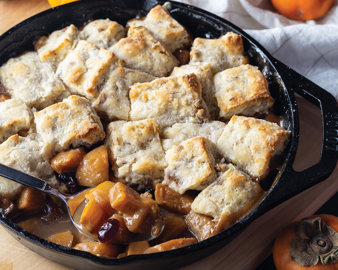 Persimmon-Cranberry Cobbler is a cozy dessert that blends ripe Fuyu persimmons with tart cranberries, apple cider, and warm spices, all topped with a buttery pecan-studded biscuit crust. Baked in a cast-iron skillet until golden and bubbling, this seasonal cobbler is perfect for holiday gatherings, fall dinners, or any occasion that calls for a comforting dessert.