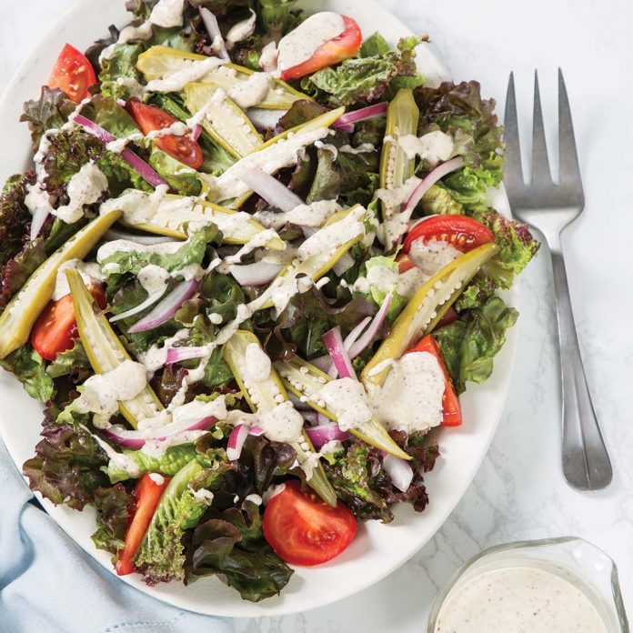 Pickled okra and a Creole mustard-based dressing give this salad lots of tang, which pairs well with the smoky flavors in our jambalaya and cornbread.