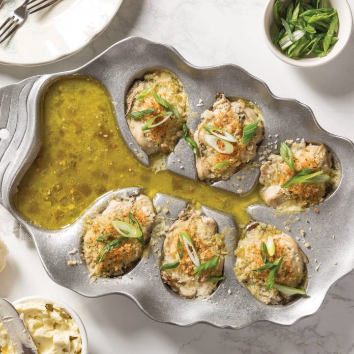 We used The Oyster Bed, a metal oyster dish, but you could use 6 (4-ounce) ramekins. Visit theoysterbed.com to purchase or find retailers.