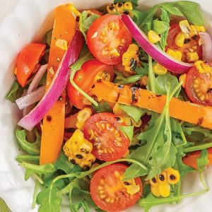 - Cut kernels off cob. In a large bowl, combine corn, bell pepper, tomatoes, and onion. Add 2 tablespoons Lemon-Thyme Vinaigrette and half of salt, tossing to coat. Add arugula, pepper, remaining Lemon-Thyme Vinaigrette, and remaining salt, tossing until combined. Serve immediately.