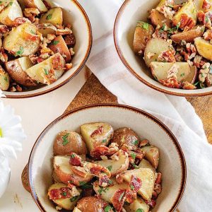 - In a large bowl, toss together vinegar mixture, potatoes, pecans, bacon, parsley, remaining ½ teaspoon salt, and remaining ¼ teaspoon pepper.