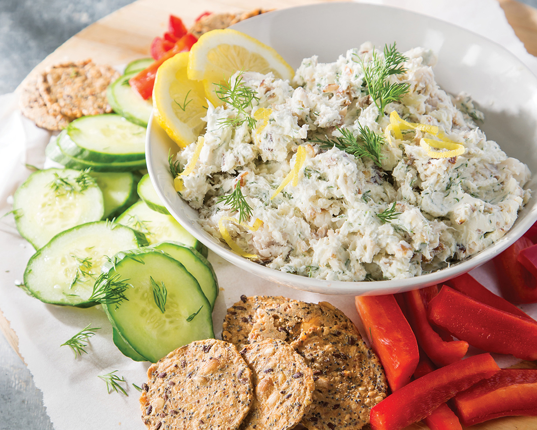 - In a medium bowl, combine smoked catfish, cream cheese, dill, parsley, lemon juice, remaining ¼ teaspoon salt, and remaining ¼ teaspoon black pepper. Serve with crackers, cucumber, and bell pepper. Garnish with dill, lemon zest, and lemon wedges, if desired.