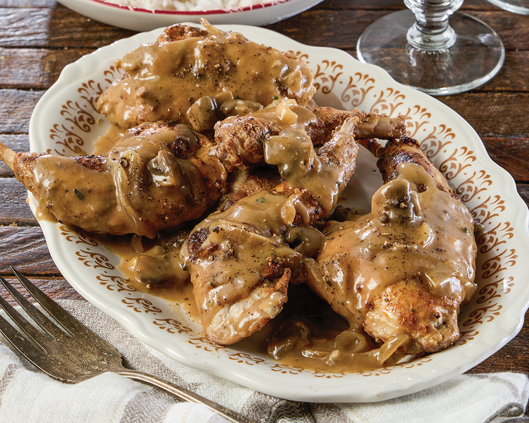 Tender smothered rabbit in a savory gravy with onions and mushrooms, served the Louisiana way over rice.