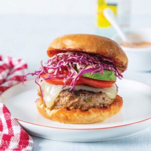 6. Transfer burgers to bottom halves of toasted buns; top each with sliced tomato and avocado. Combine shredded cabbage and remaining ¼ cup Chipotle Mayonnaise, tossing to coat. Divide cabbage mixture evenly on top of avocado. Top with remaining bun halves. Serve immediately.