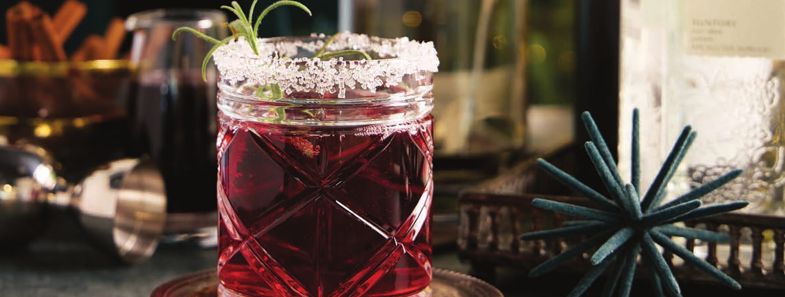 - In a cocktail shaker, combine gin, lemon juice, and Spiced Cranberry Simple Syrup. Add ice, cover, and shake until cold. Strain into prepared glasses. Top with wine. Garnish with rosemary, if desired.