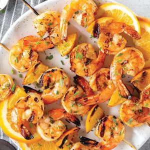 Squeeze a fresh orange slice over these shrimp skewers to really make the flavors pop.