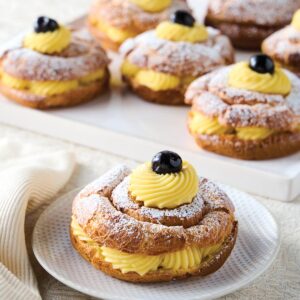 - Transfer Pastry Cream to a large pastry bag fitted with a ½-inch open star piping tip (Ateco #826). Pipe tall rosettes around bottom half of each cake. Cover with top half, and gently press down. Pipe a rosette on top of each cake, and place a cherry on top. Garnish with confectioners’ sugar, if desired.