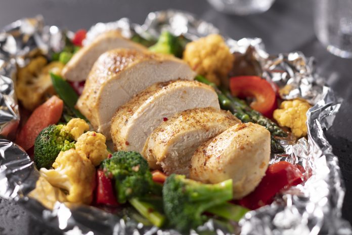 1. Place 1 chicken breast and 1 cup of vegetables on a piece of heavy-duty foil.