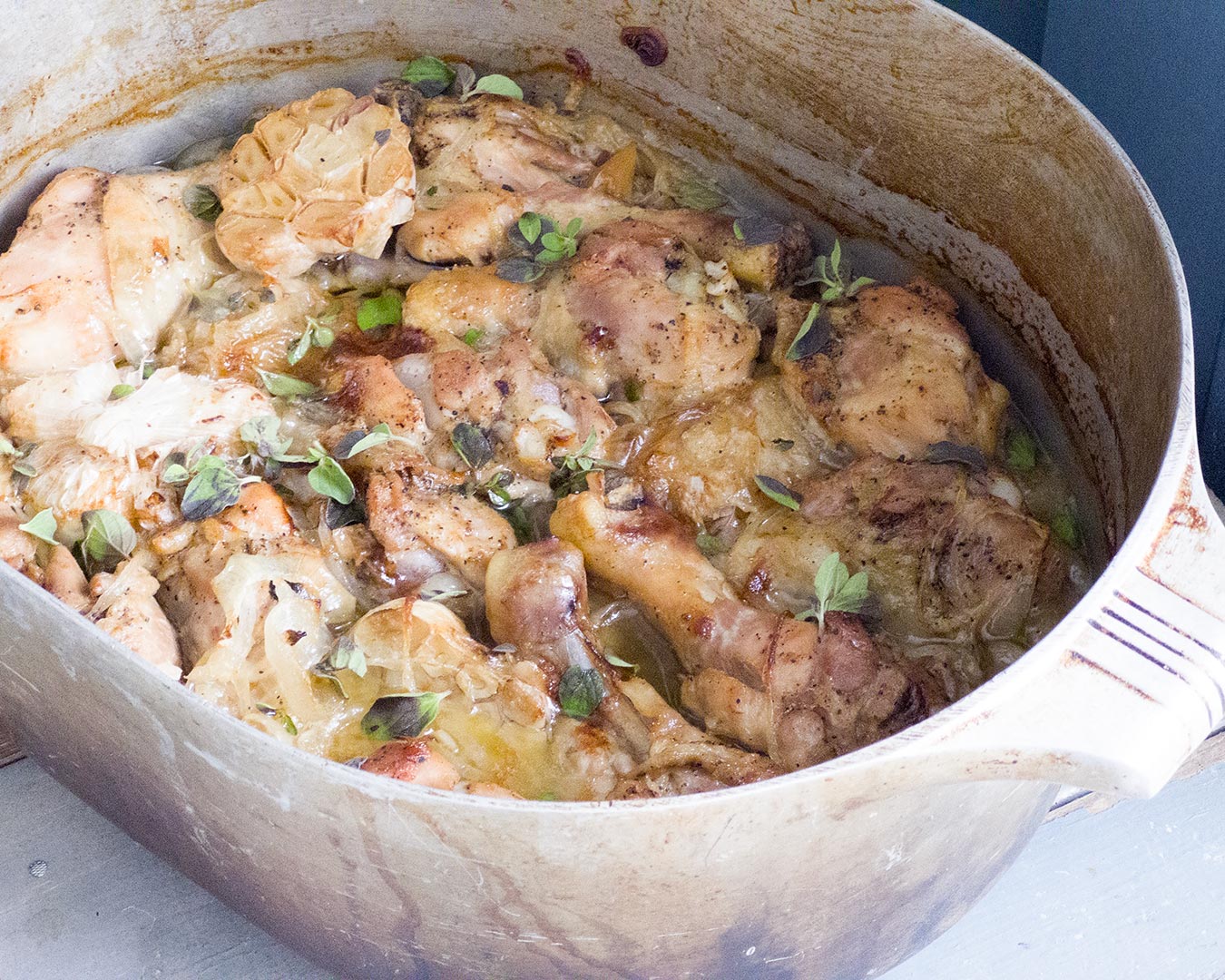 - Bake for 30 minutes. Using tongs, turn each piece of chicken. If there isn’t much liquid in the pan, cover, and bake for 15 to 20 minutes more. Bake, uncovered, for about 20 minutes more. Check to make sure liquid is evaporating but not dry. Cover and bake until liquid is reduced and top is browned, about 20 minutes more. Squeeze garlic cloves from garlic heads, discarding heads. Top with marjoram, if desired, and serve with rice.