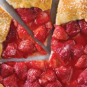 - On a heavily floured surface, roll dough into a 13-inch circle, about ⅛ inch thick. Carefully transfer to prepared pan. Pour strawberry mixture in center, leaving a 2-inch border. Carefully fold edges of dough over strawberries, pinching to seal edges of folds. (Filling will spill out if not sealed properly. See note.) Brush egg onto dough, and sprinkle with sparkling sugar.